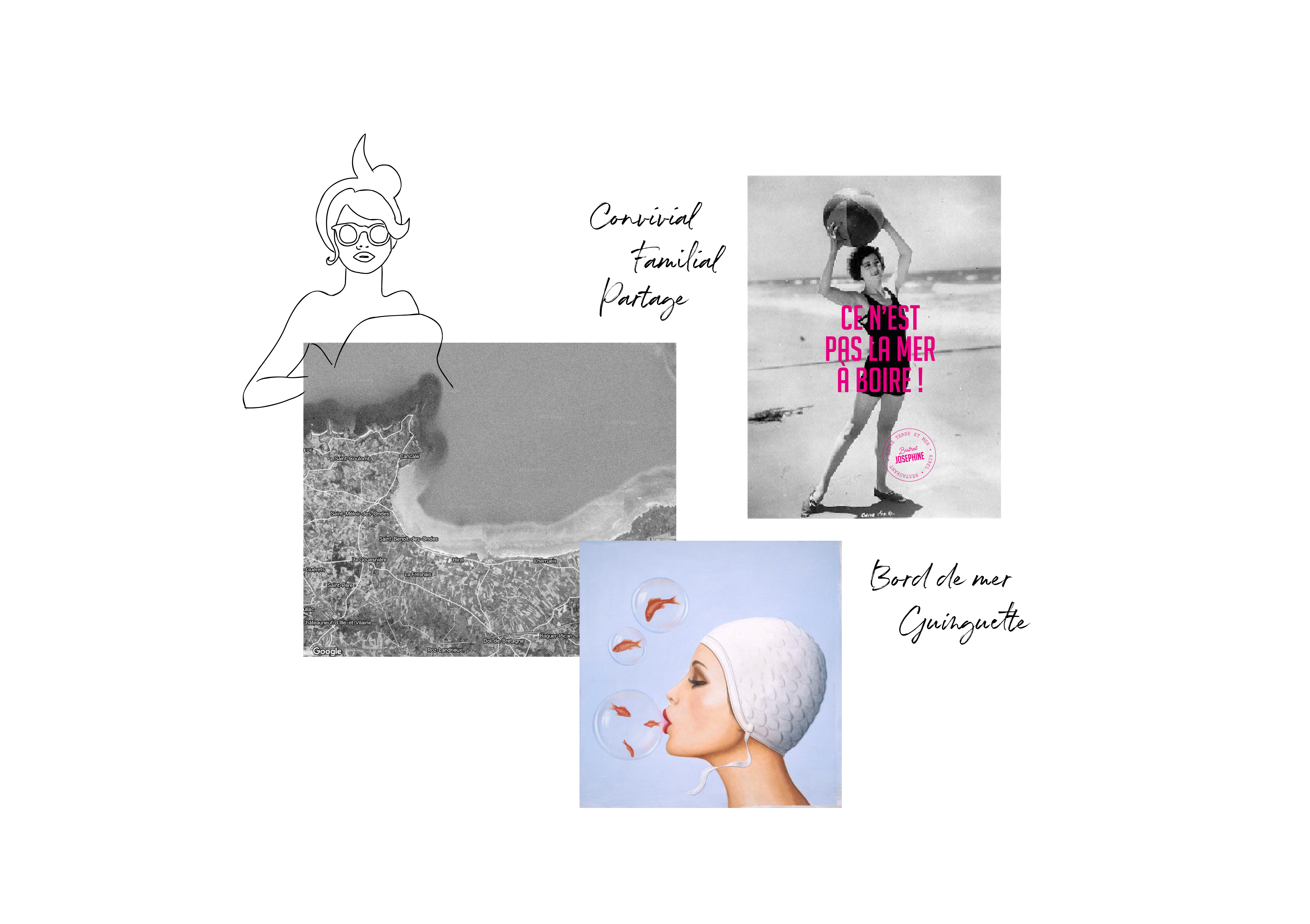 Pour l’identité visuelle, Atelier Sésame a imaginé un univers inspiré des bains de mer et de codes graphiques rétro, afin de raconter une histoire autour du prénom Joséphine - la grand-mère de Pascal ! Le logo associe une typographie droite et vintage à une illustration de plongeuse, pensée comme une mascotte. Ce dessin en mouvement évoque la mer, les vacances et l’énergie du lieu !