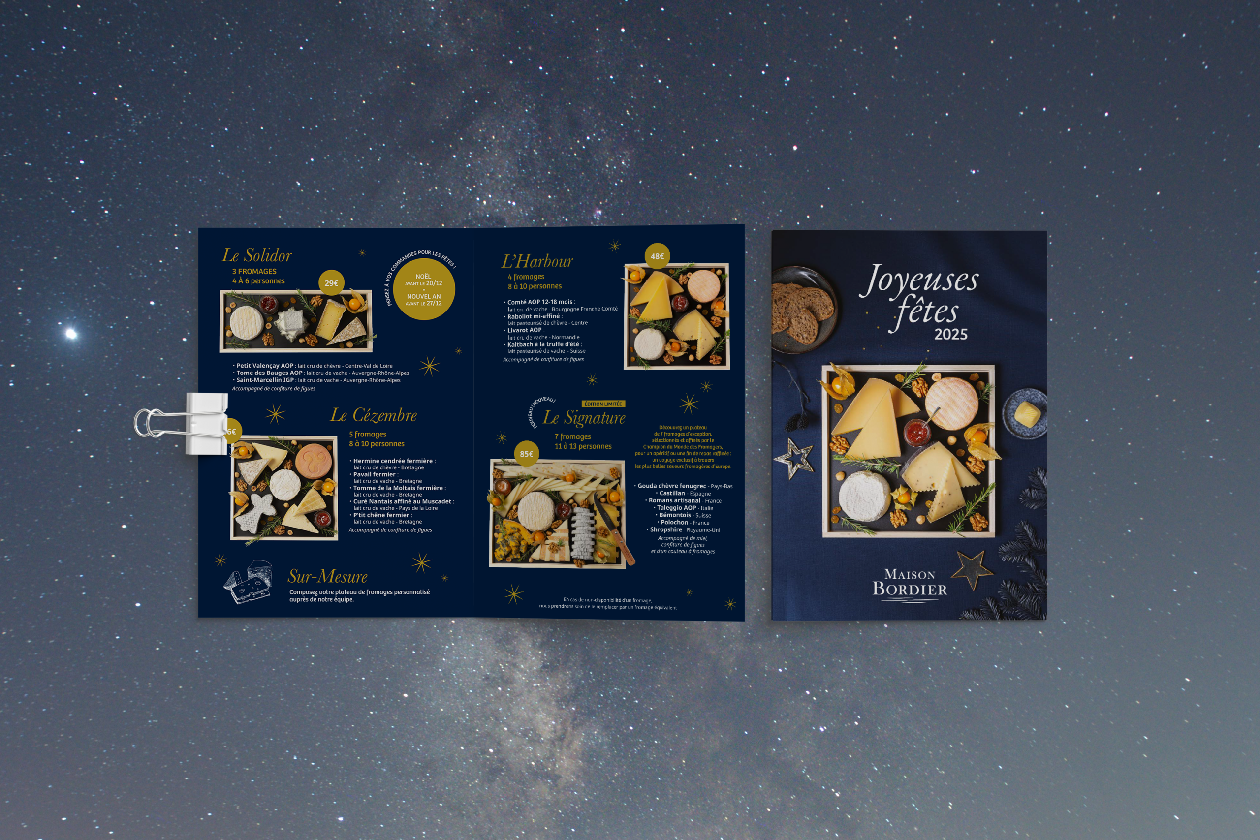 Dans le cadre des fêtes de fin d’année, Atelier Sésame a assuré la direction artistique du flyer de promotion des plateaux de fromages de la Maison Bordier.