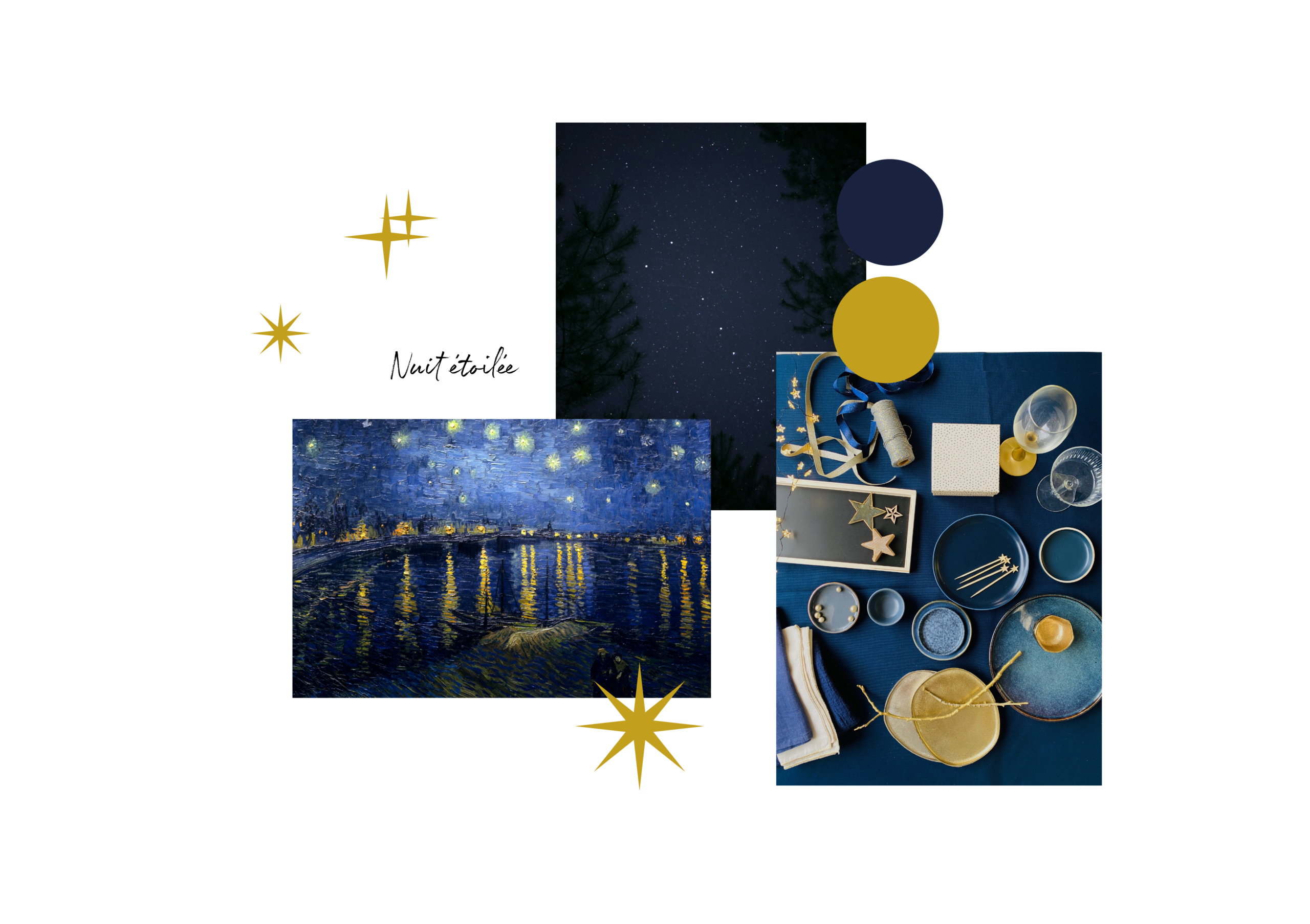 À partir du thème de la nuit sous les étoiles, nous avons imaginé un univers élégant, plus premium. En collaboration avec Anne-Sophie Lacharme, styliste culinaire, nous avons pu créer un univers bleu et doré pour valoriser les produits des fêtes !